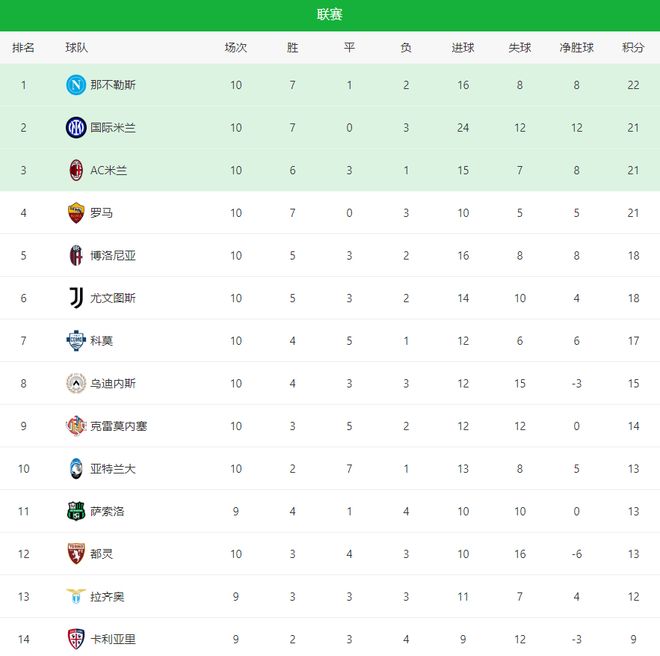 另外一场比赛,国际米兰2-1险胜维罗纳,开局第16分钟,国米利用角球创造机会,泽林斯基在大禁区前沿不停球爆射打破僵局;随后第40分钟维罗纳前锋吉奥瓦尼暴力突入禁区,一脚怒射将比分扳成1-1。下半场国米攻势不断,但效率始终欠佳。比赛进入补时阶段,国米凭借巴雷拉的精准传中维罗纳后卫忙中出错自摆乌龙,蓝黑军团有惊无险2-1拿下对手。凭借这场来之不易的胜利,国米积分升至21分,凭借净胜球的优势力压米兰排行老二,仅落后榜首那不勒斯1分。维罗纳则继续苦吞不胜的尴尬,以5分排名倒数第三。
